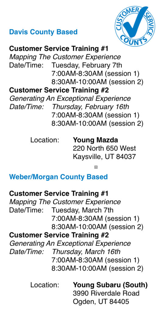 It is now officially February of 2017 and time to think about delivering exceptional customer service! We’ll be holding Customer Service Training starting next week at Young Mazda in Kaysville for the Davis County based employees. The same trainings will be coming to Weber & Morgan Counties in March (and remote locations to follow shortly after). This set of trainings counts towards Sales Certification for all variable employees, but is designed for everyone. As usual, additional information can be found at YOUNGCOE.COM.