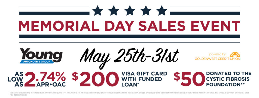 The Memorial Day Sales Event is kicking off this week, and will run through May 31st. Young Automotive Group is partnering with Goldenwest Credit Union to offer financing as low as 2.74%, a $200 Visa gift card with every purchase, and a $50 donation to the Cystic Fibrosis Foundation with every purchase. Get ready for […]