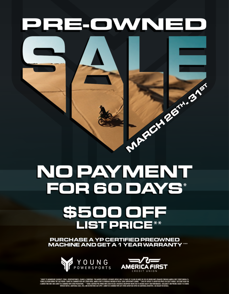 Hey YAG Family, Our team at Young Powersports is thrilled to kick off our Pre-Owned Sale! From now till March 31, we’ll be working with our friends at America First Credit Union to provide qualifying customers with: This sales event rings in riding season, and we need everyone’s help to make it a success. Please […]