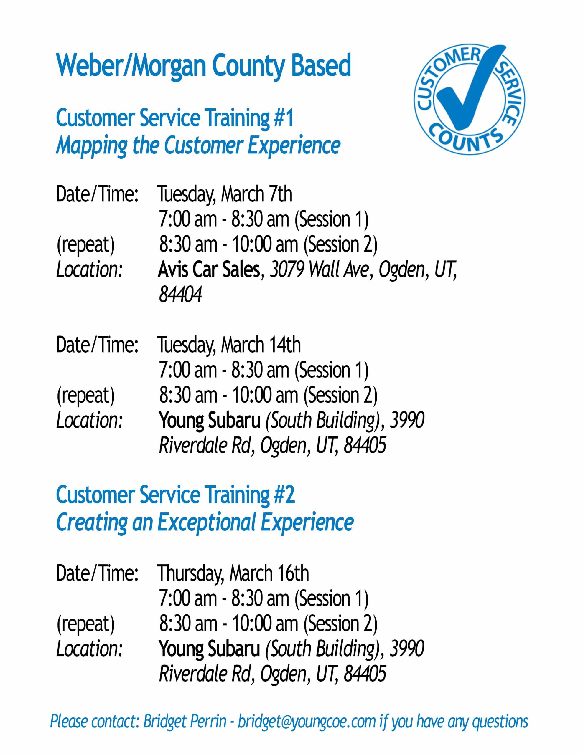 We’ll be holding Customer Service Training #1 next week at Avis Car Sales in Ogden for the Weber/Morgan County based employees. This set of trainings counts towards Sales Certification for all variable employees, but is designed for everyone. We have scheduled Customer Service Training #1 on two separate days. Due to training overlapping with other meetings, some employees are unable to attend training on the 7th March. Therefore, you can attend that same module on the 14th March at Young Subaru (South). Please see the below schedule.