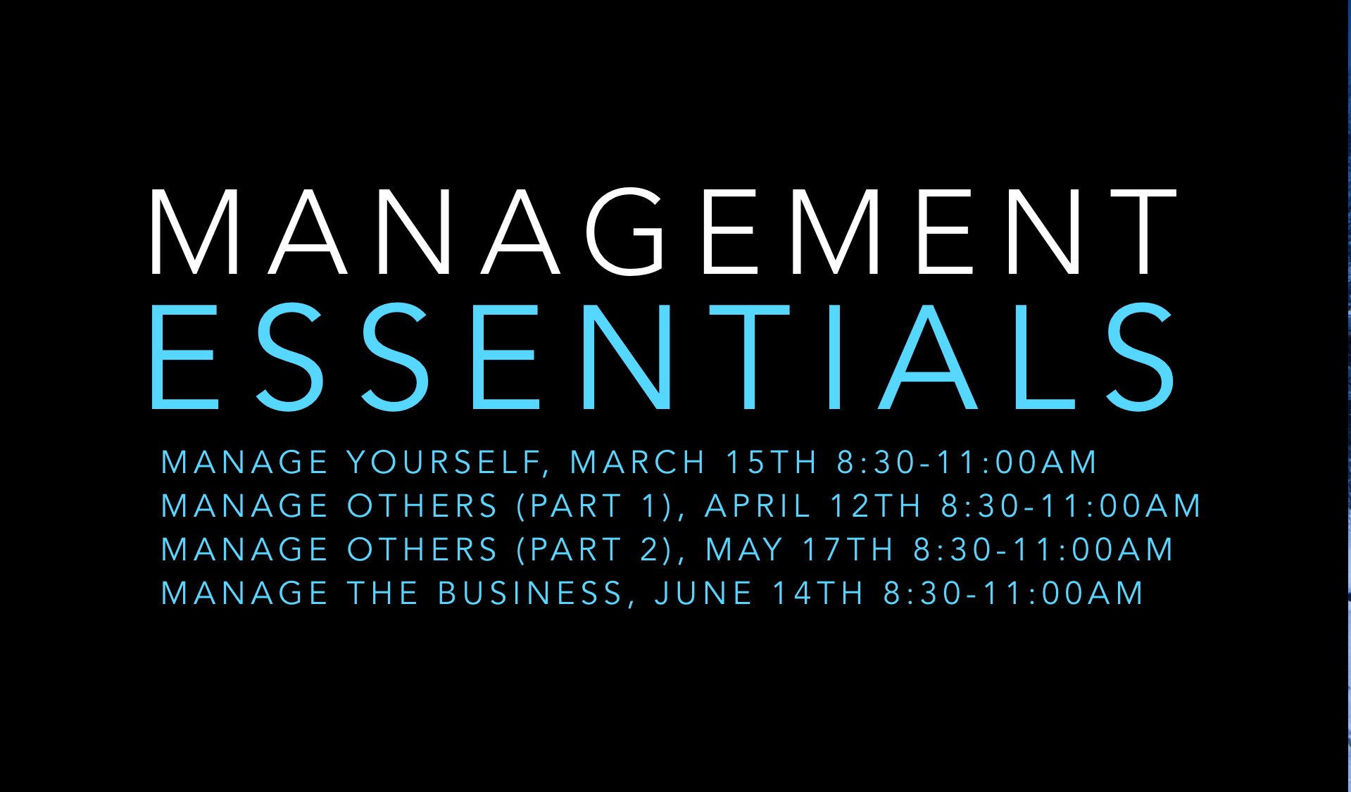2017 Management Essentials starts in March! This training Series is designed to better equip managers to build, broaden, and refresh practical management skills. During these four workshops, participants will learn to manage themselves, others, and the business. Seating is limited to 20 participants so please register today by clicking here: