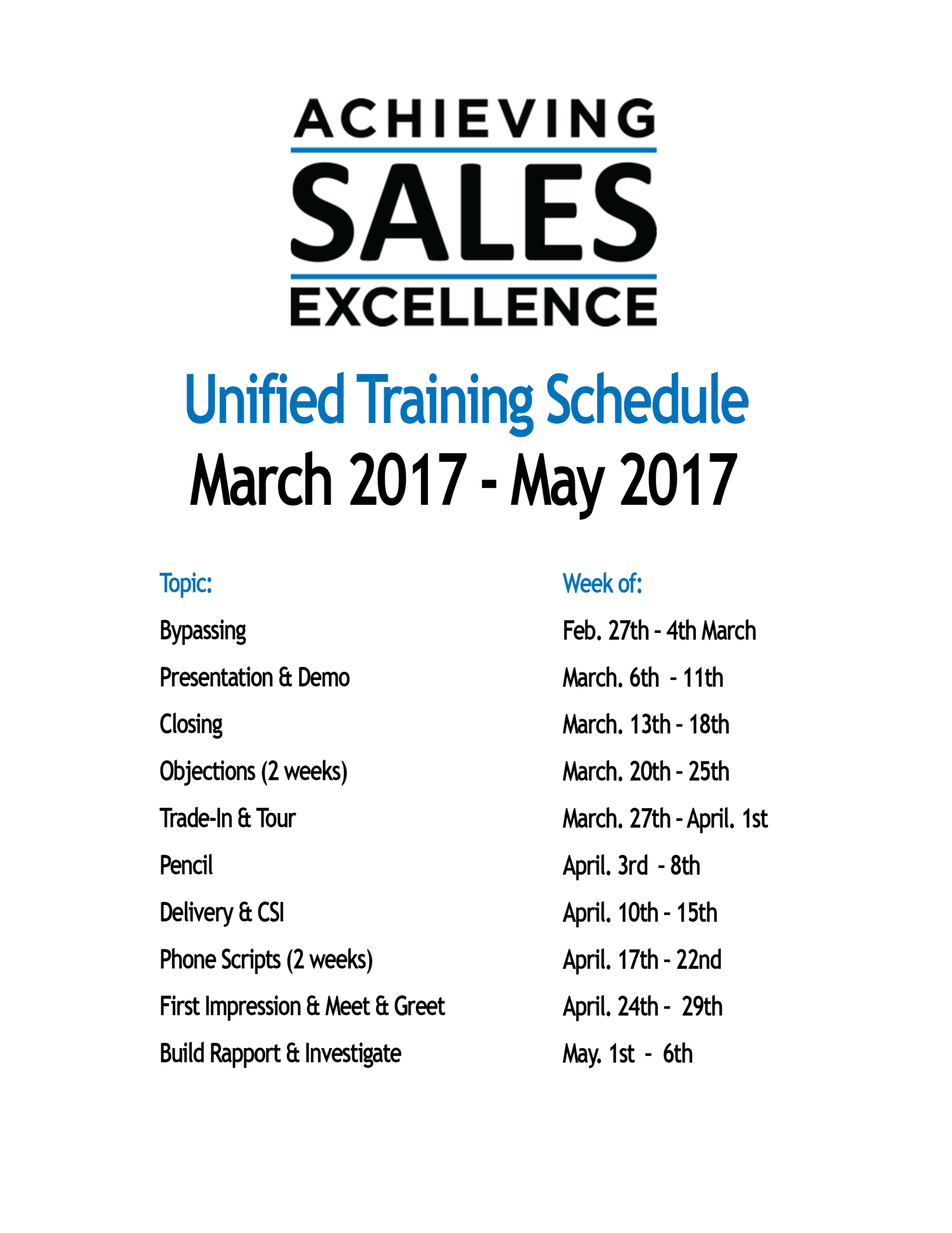 Its been a while since we’ve used the Unified Training Schedule. Lets please get back to this. A Unified Training Schedule allows all of our stores to be on the same page when it comes to your “Achieving Sales Excellence” Training. When the COE partners visit the stores, we will be assisting with the week’s training in any way that we can.